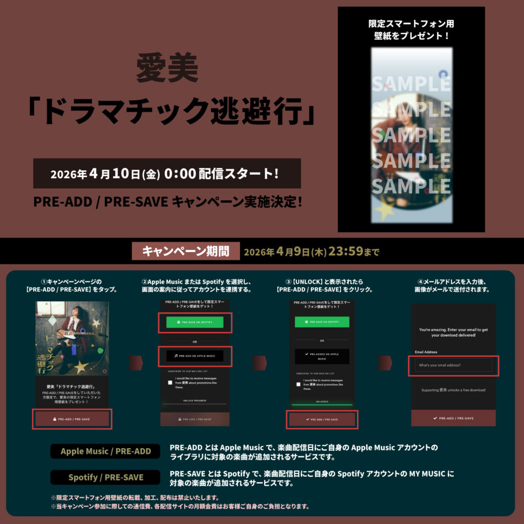 2026年4月10日(金)に配信される「ドラマチック逃避行」をキャンペーンURLから期間内に Apple Music で PRE-ADD またはSpotify で PRE-SAVE していただいた方全員に、愛美の【限定スマートフォン用壁紙】をプレゼント!